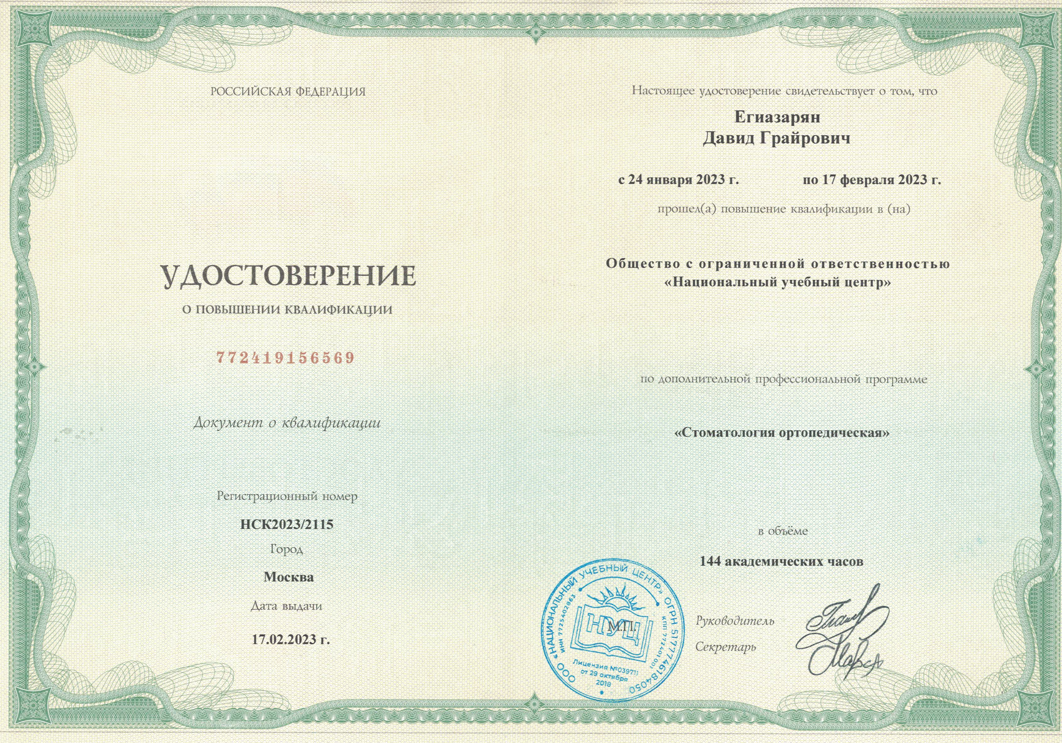 - 2023 г. ООО "Национальный учебный центр" повышение квалификации "Стоматология ортопедическая".