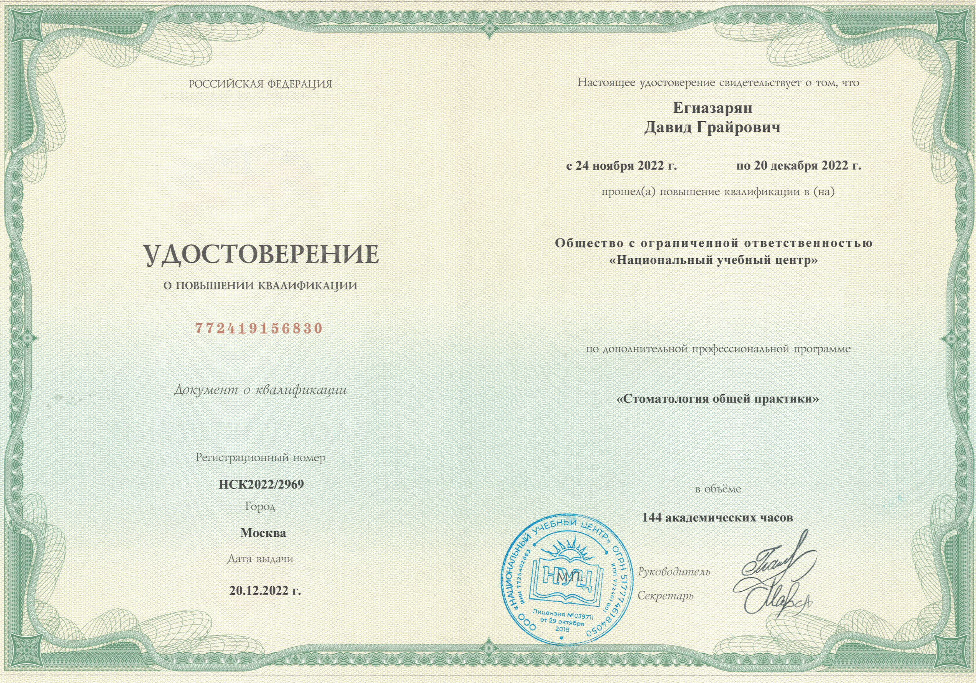 - 2022 г. ООО "Национальный учебный центр" повышение квалификации "Стоматология общей практики".