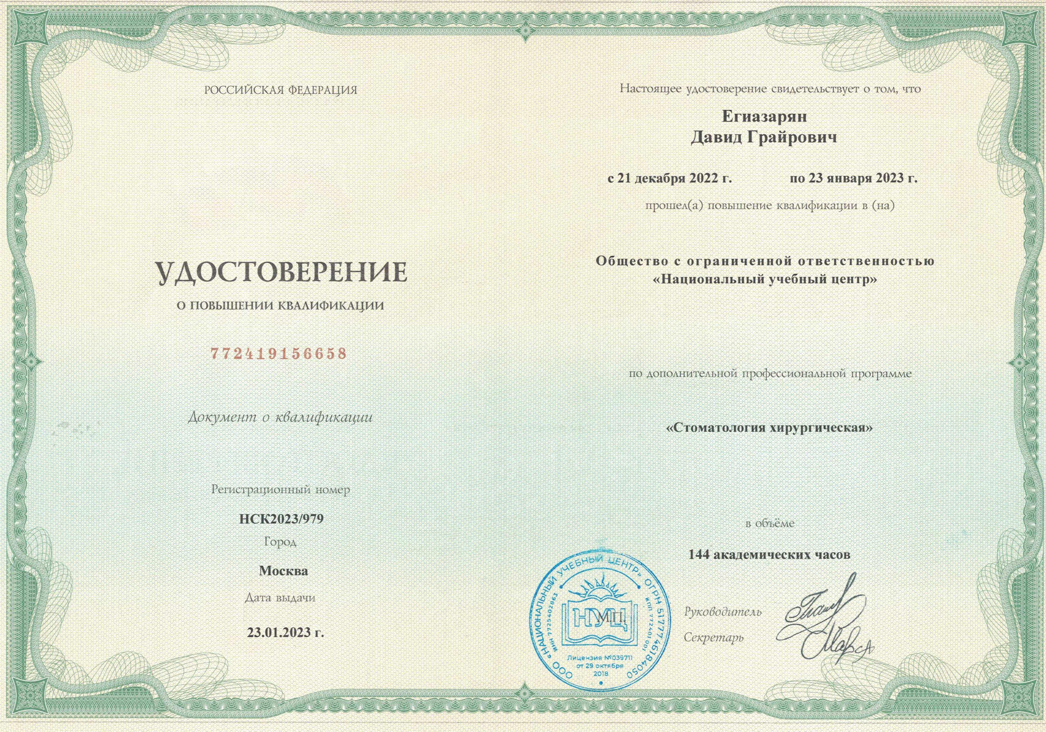 - 2023 г. ООО "Национальный учебный центр" повышение квалификации "Стоматология хирургическая".