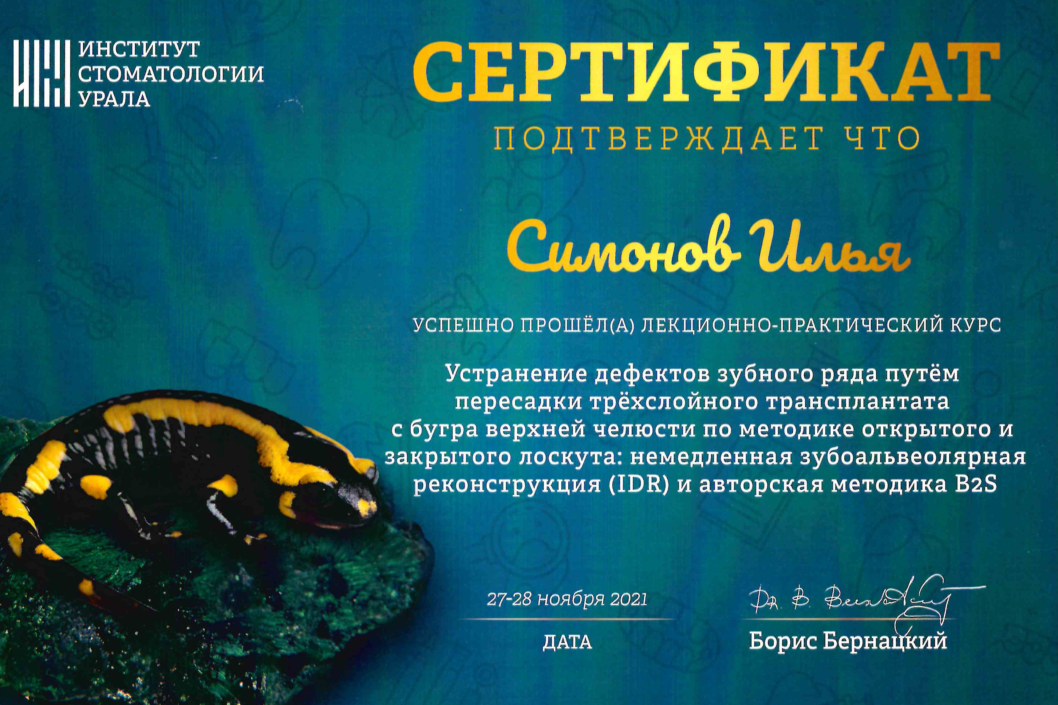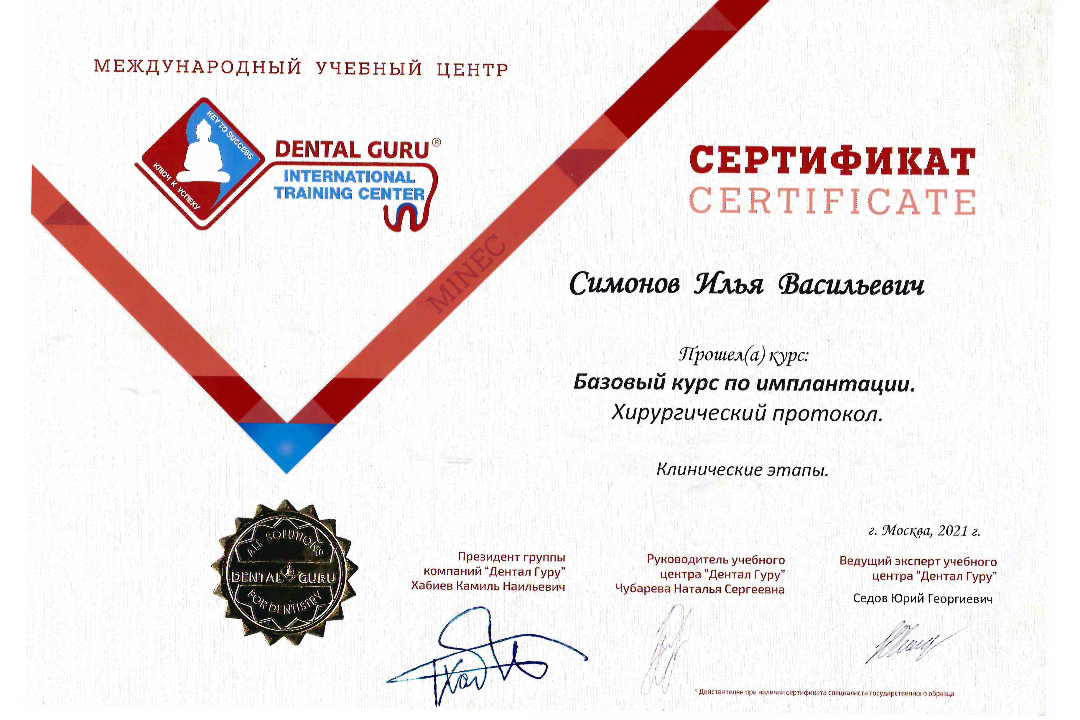 - 2021 г. курс "Устранение дефектов зубного ряда путем пересадки трехслойного трансплантата с бугра верхней челюсти по методике открытого и закрытого лоскута: немедленная зубоальвеолярная реконструкция (IDR) и авторская методика B2S"