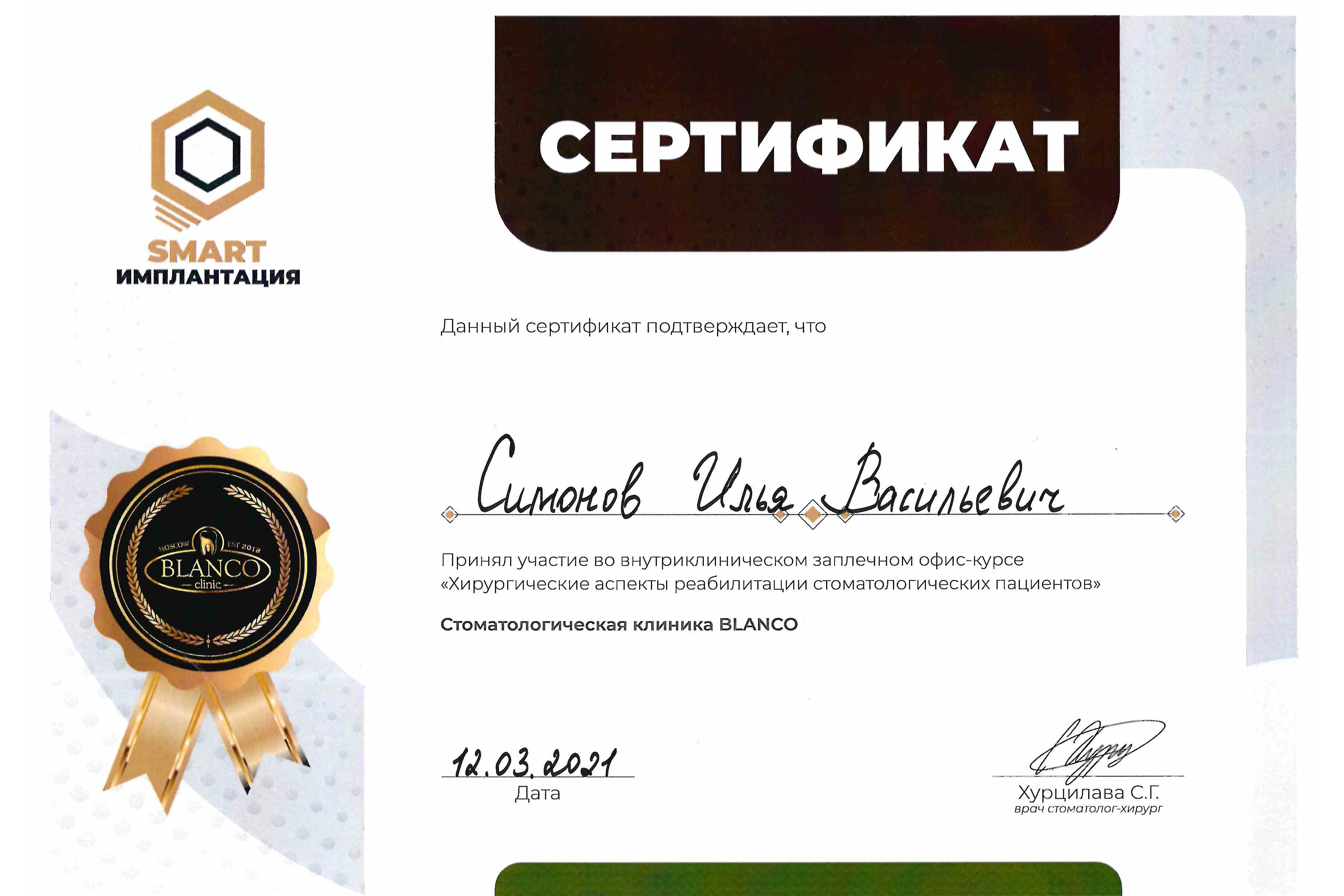 - 2021 г. участник конференции «Системный подход в имплантации при полной адентии»