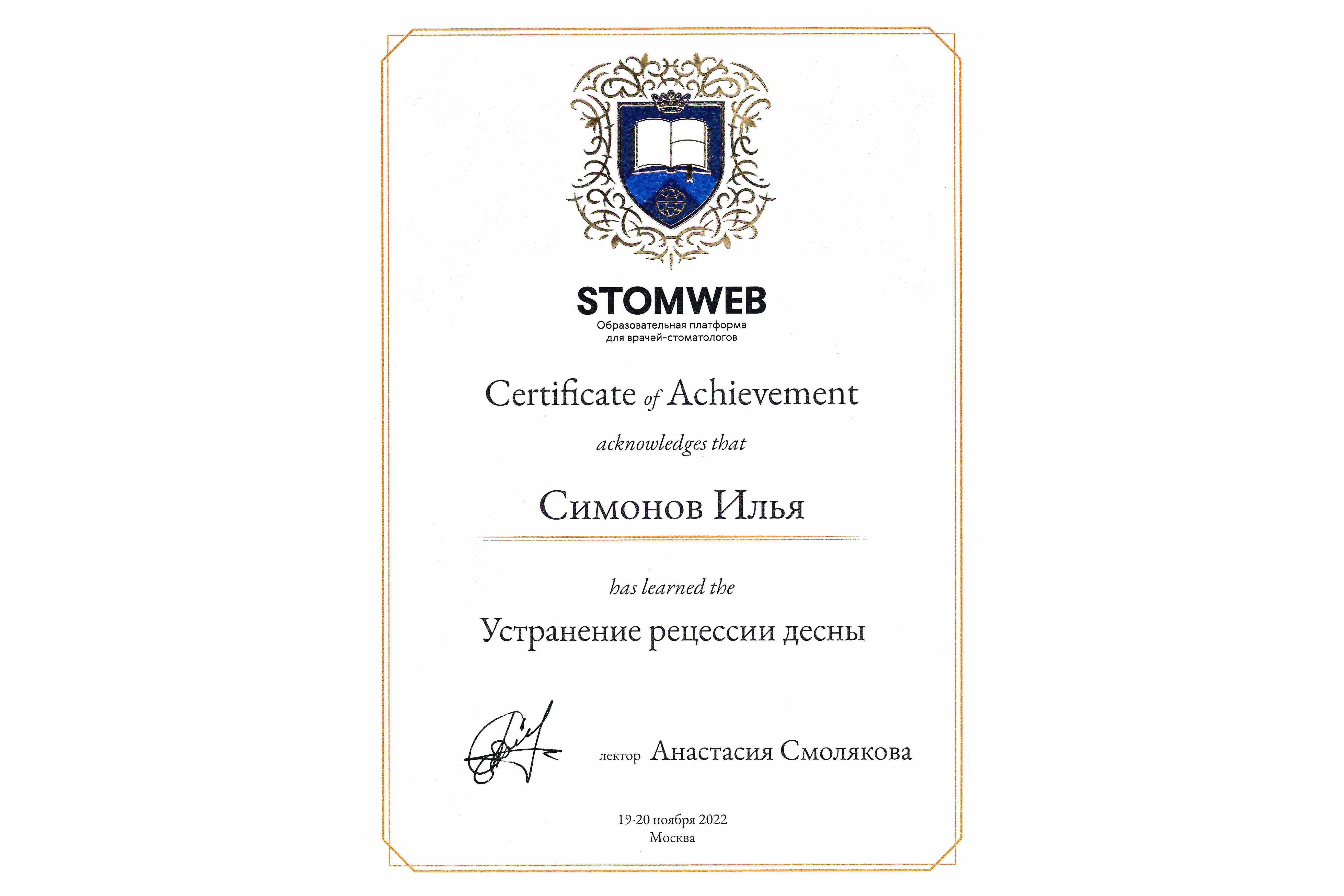 - 2022 г. "Устранение рецессии десны", А. Смолякова